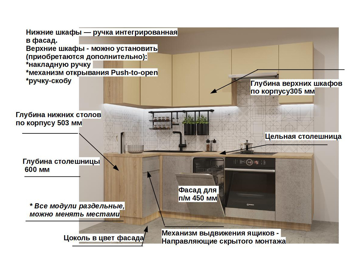 Кухонная мойка, стеновая панель, посудосушитель, планки для столешницы в комплект не входят.