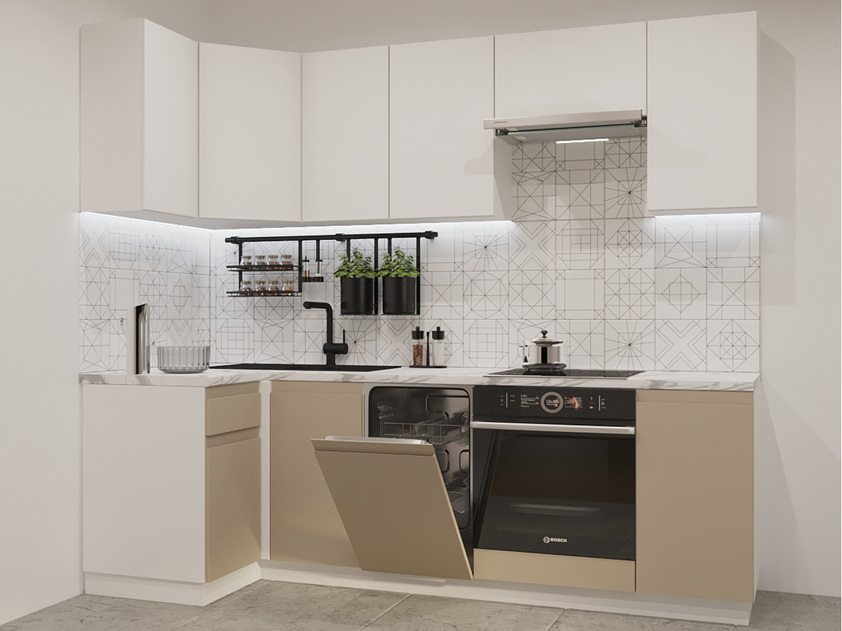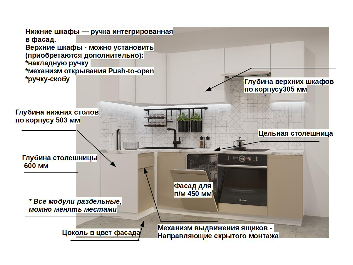 Кухонная мойка, стеновая панель, посудосушитель, планки для столешницы в комплект не входят.