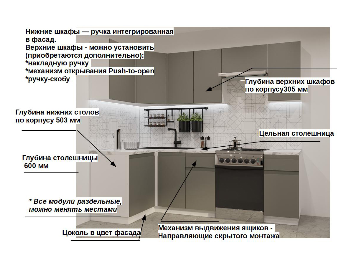 Кухонная мойка, стеновая панель, посудосушитель, планки для столешницы в комплект не входят.