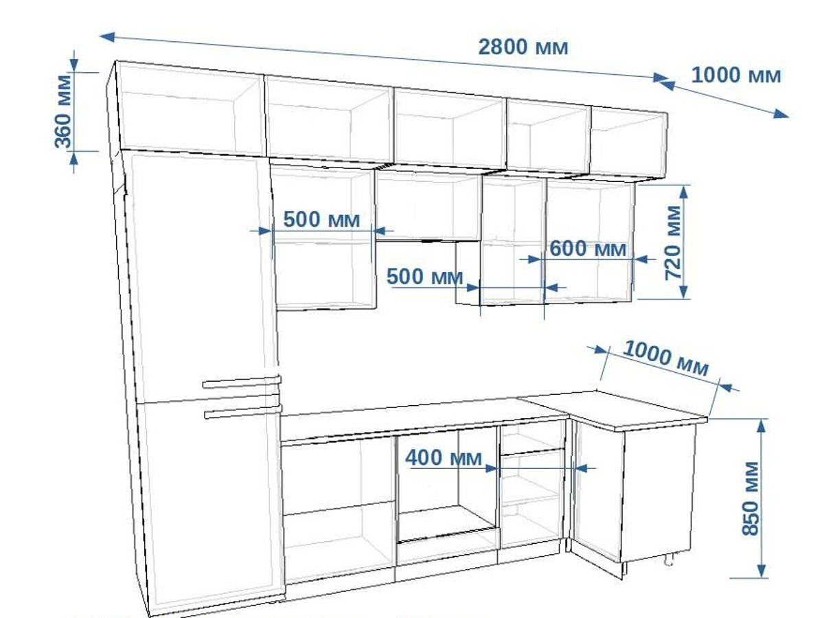 - высота верхних шкафов 720 мм