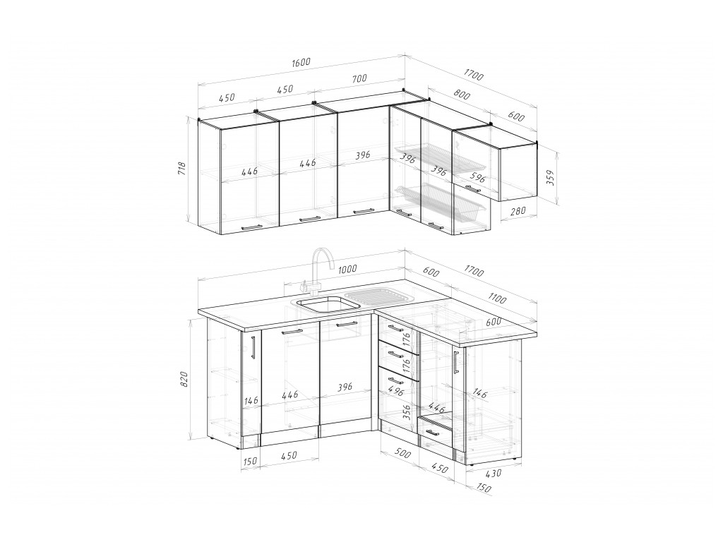 Мойка, смеситель, стеновая панель и посудосушитель в комплект гарнитура не входят.
