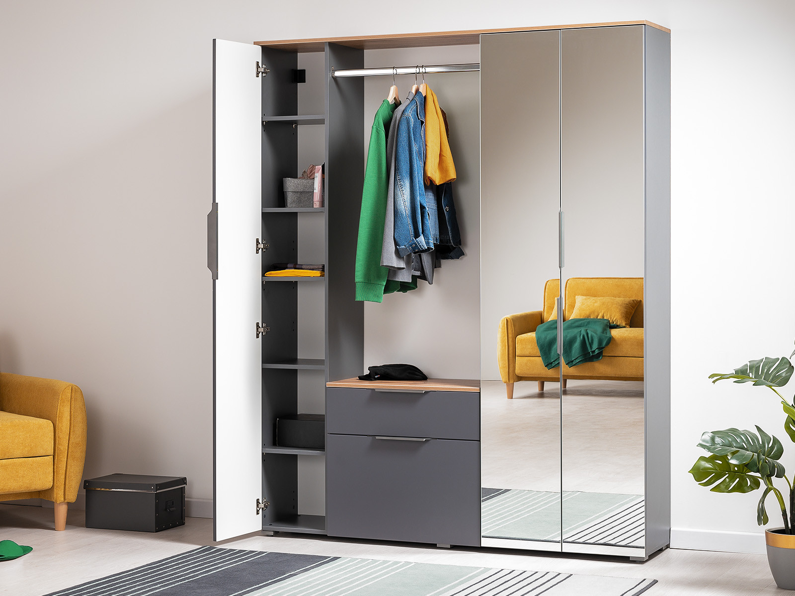 Фурнитура: Шариковые направляющие полного выдвижения, алюминиевые ручки, выдвижная вешалка