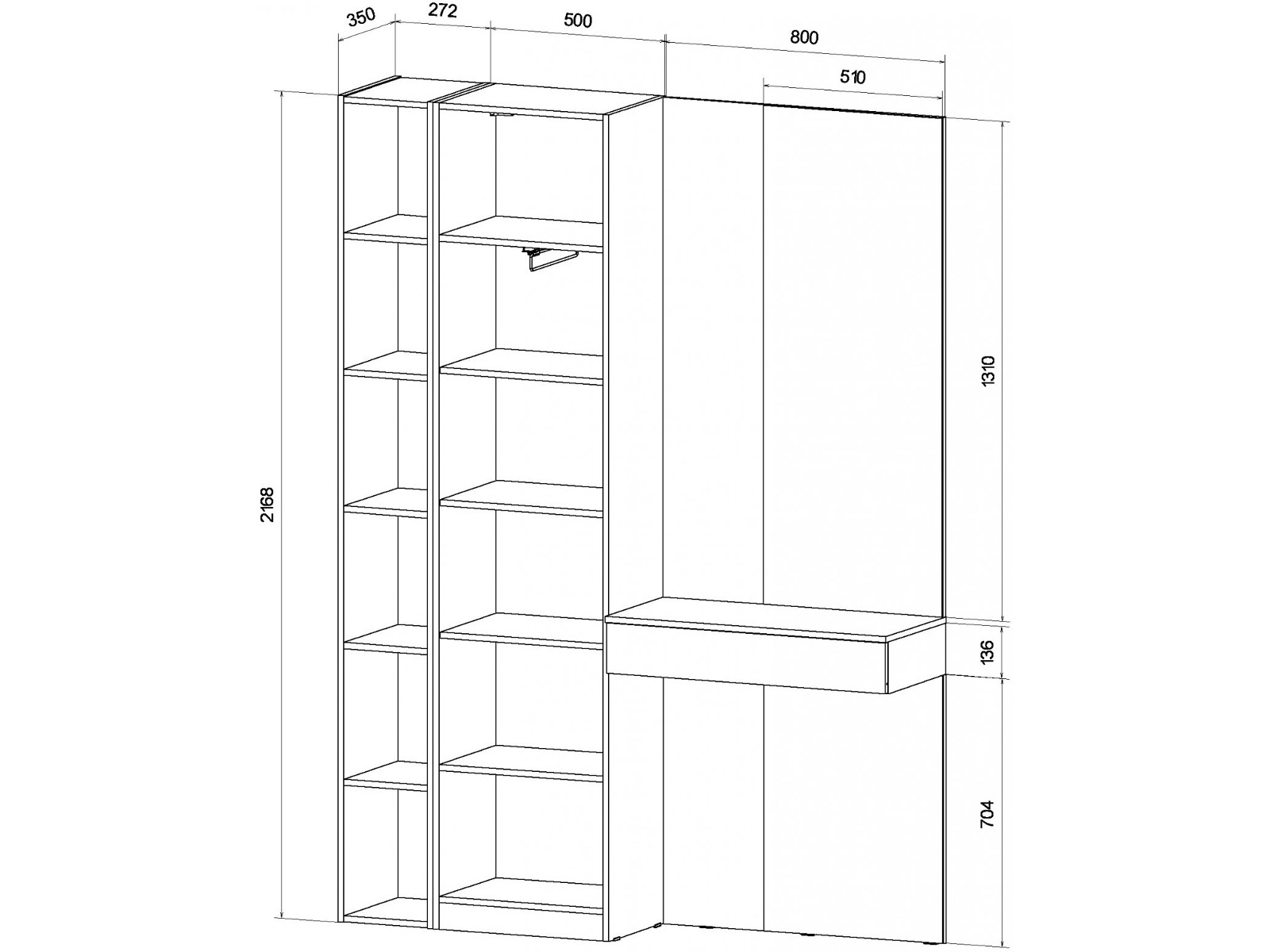 Габариты Ш*Г*В: 1572х350х 2168 мм.