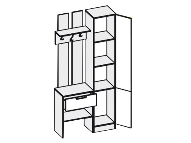 Прихожая имеет простой дизайн и прямые формы. Она состоит из вешалки с тумбой и пенала. Открытая вешалка оборудована полкой для головных уборов, тремя 3-х рожковыми крючками для одежды, ниже выдвижной ящик на роликовых направляющих, под ним открытая ниша с полкой. За распашными дверьми пенала три полки. Тип сборки и направление открытия дверей определеяется при сборке.