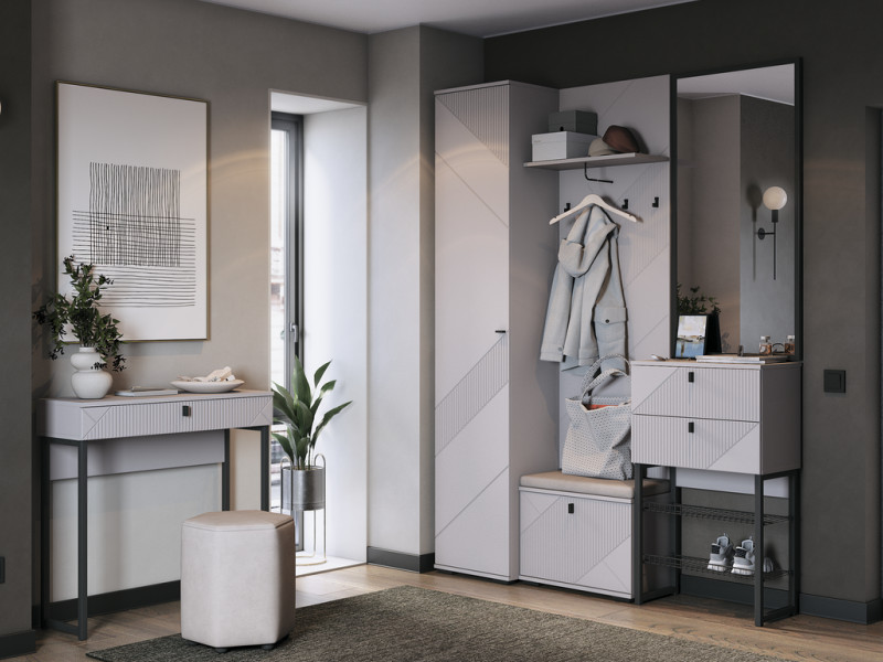 Цена за комплект: Консоль, Шкаф 1 дверный, Тумба с мягким элементом, Вешалка, Зеркало настенное в профиле , Тумба с ящиками