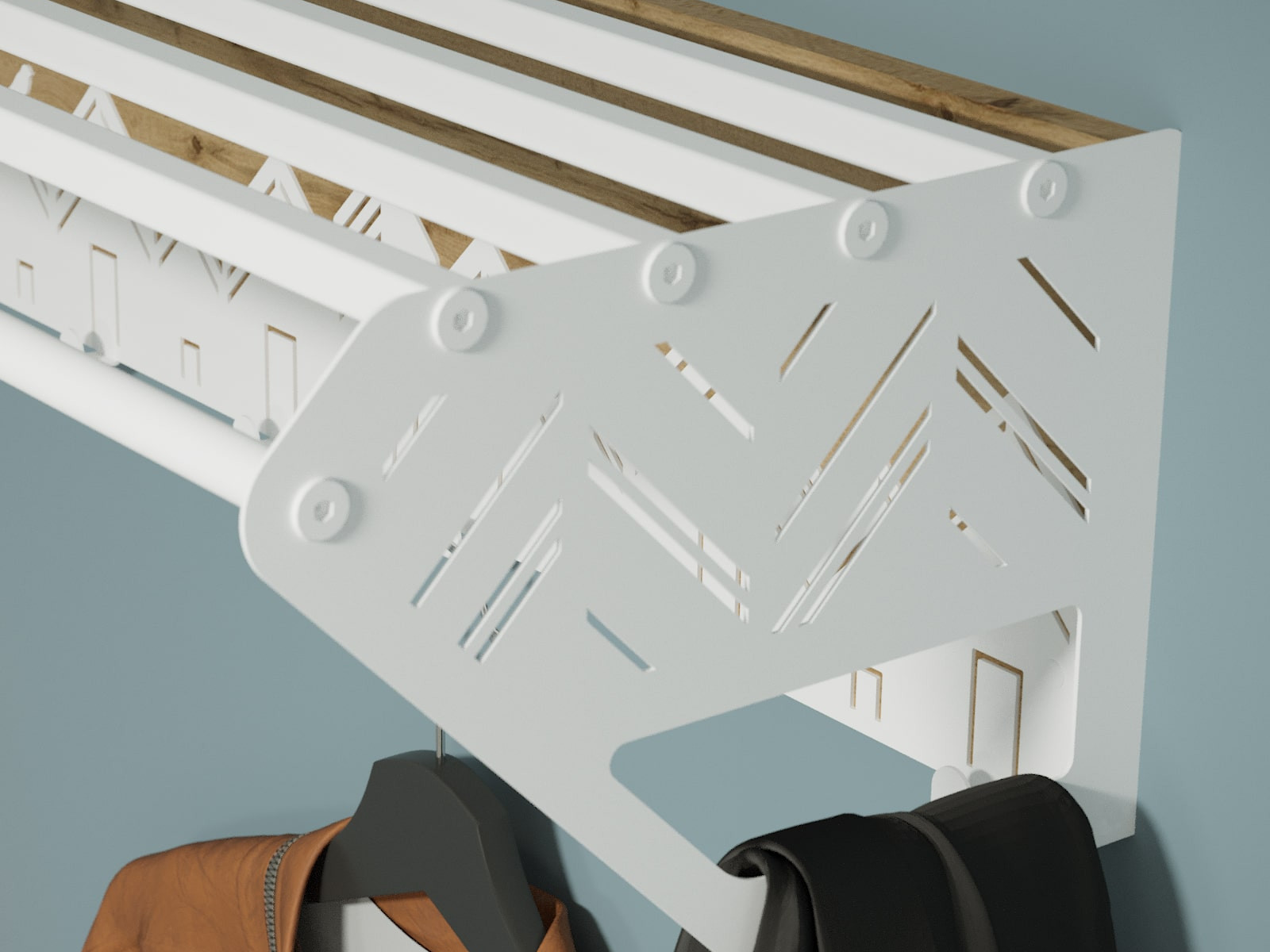 Вешалка выполнена из экологичного и прочного материала МДФ в сочетании с листовым металлом 1,5 мм.