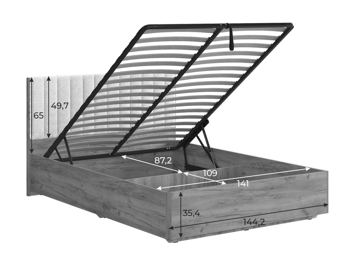 Состоит из: изголовья с мягким элементом, каркаса из ЛДСП и места спального с подъемным основанием..