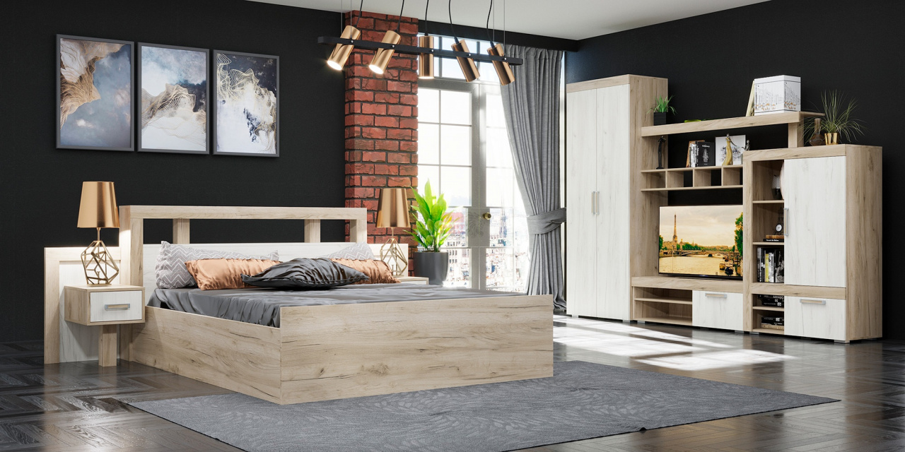 Спальня модульная, комплектуется по вашему выбору. Цена за комплект на главном фото: кровать 1200, полка 1, полка 2, тв тумба, тумба прикроватная - 2 шт, шкаф 2 створчатый, шкаф комбинированный низкий