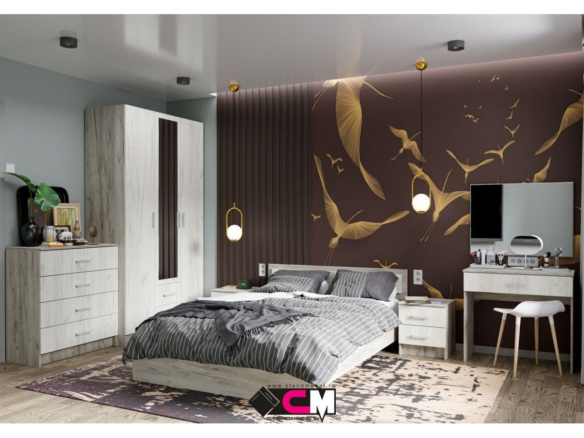 Цена за комплект: Зеркало ЗР 601, Стол трельяжный СТ 601, Тумба прикроватная ТБ 601 - 2 шт, Кровать КР 602, Комод 4 ящика КМ 601, Шкаф 3х створчатый ШК 601 М
