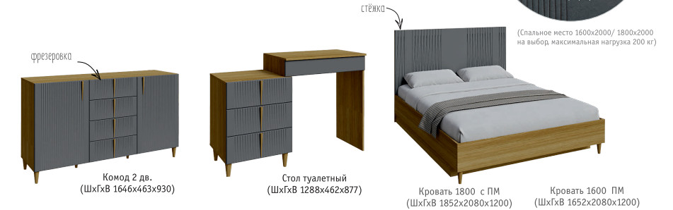 Цена за комплект: Кровать 1600 с банкеткой, Тумба прикроватная, Тумба малая, Комод 2 двери, Зеркало, Стол туалетный 1698