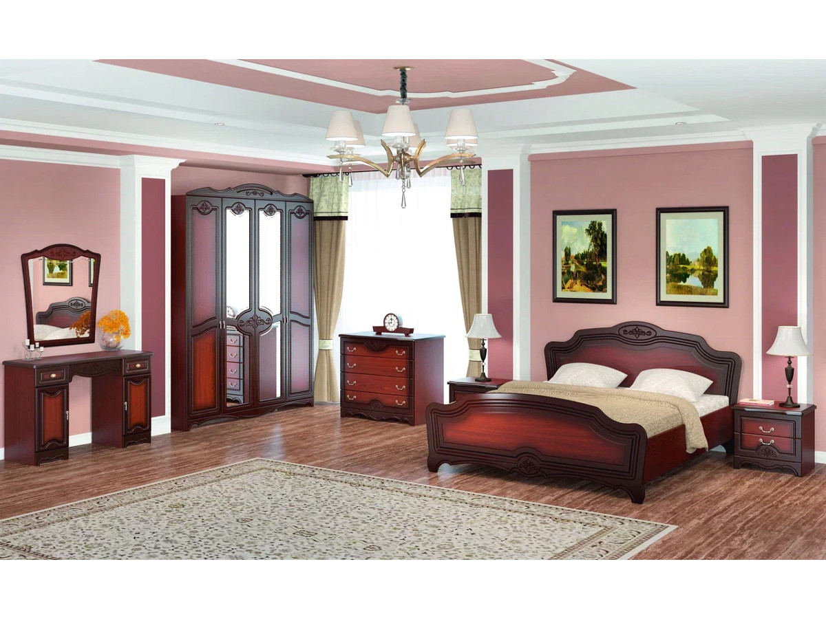 Цена за комплект: зеркало навесное, туалетный (макияжный) стол, комод 4 ящика, ШР-4 шкаф для платья и белья, тумба прикроватная (2 шт), кровать двойная 1400, опора с гибким основанием ЮР 48-03-1400 + ножки