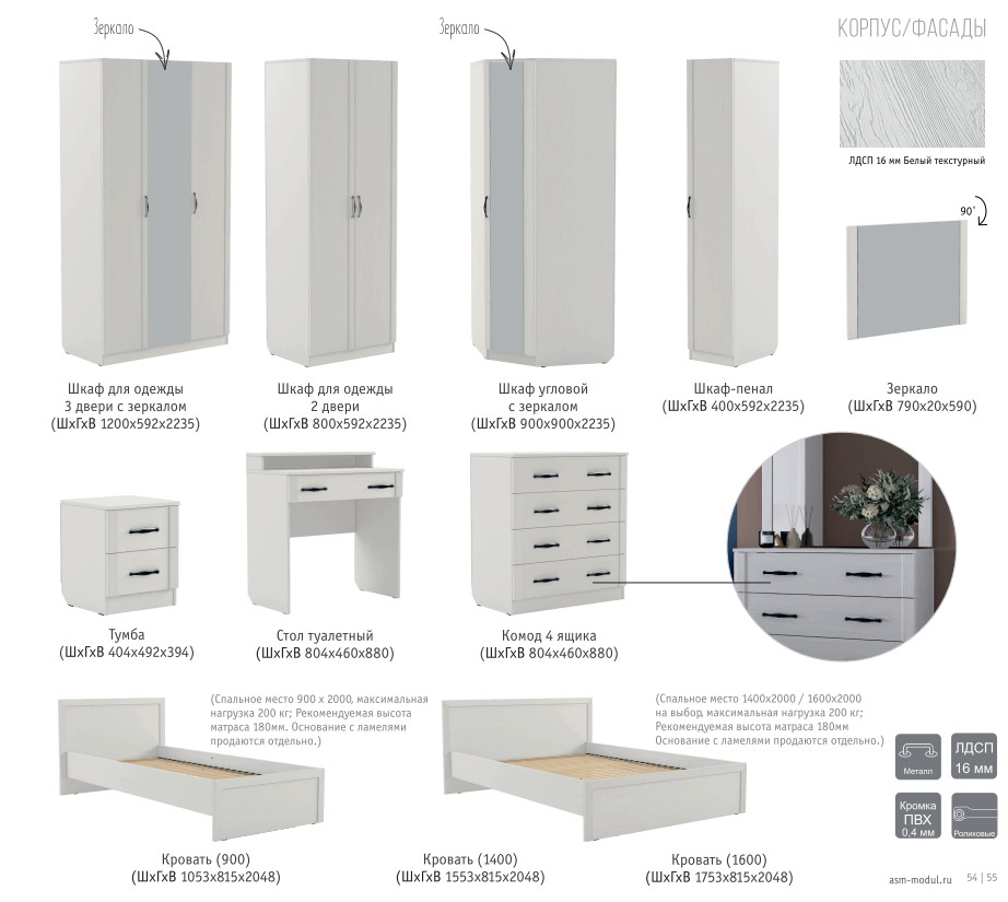 Цена за комплект: Шкаф-пенал, Шкаф угловой зеркало, Шкаф для одежды 2 двери, Тумба, Кровать (1400), Орт. основание неразборное 1400, Зеркало, Комод 4 ящика