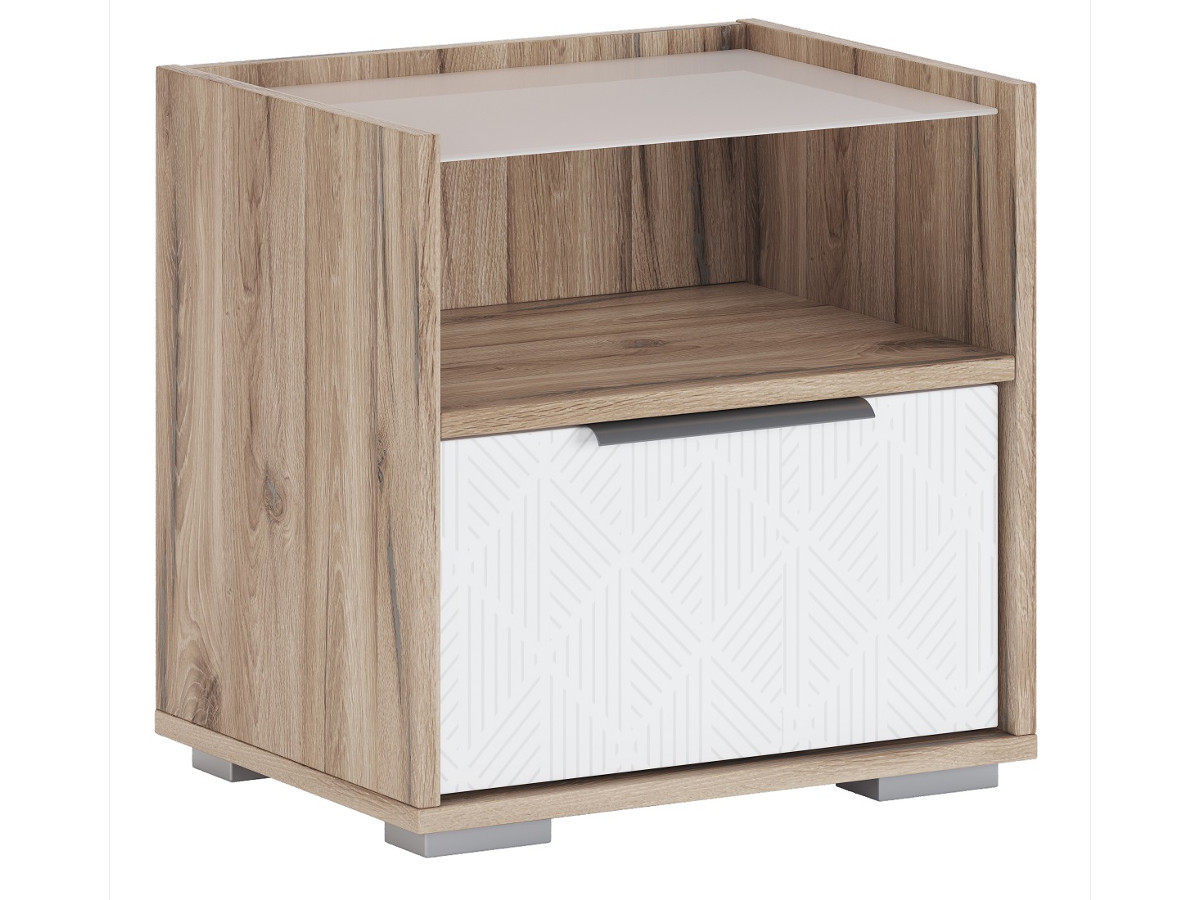 - Тумба имеет один выдвижной ящик на шариковых направляющих полного выдвижения и открытую полку, выполненную из стекла мателюкс 4 мм;