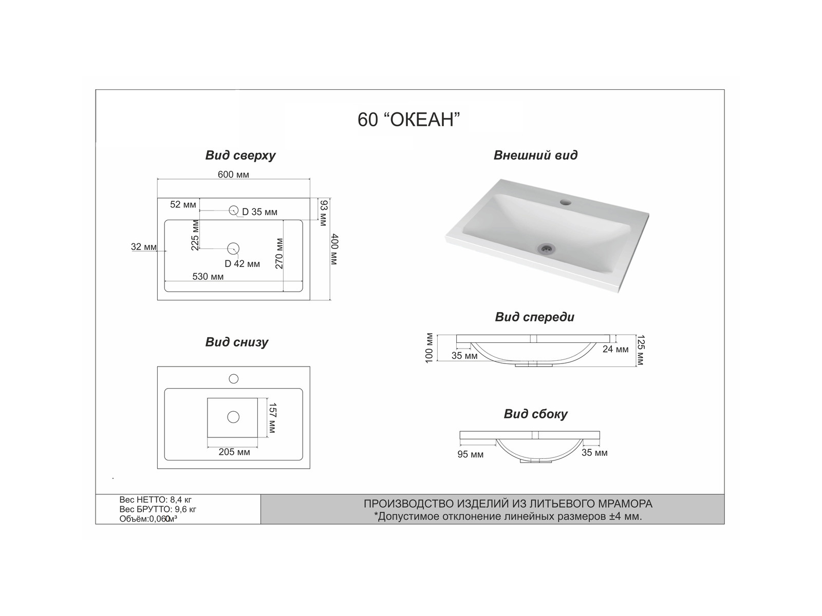 - Тумба Альба 60 подвесная 1 ящик раковина Океан 60 антрацит