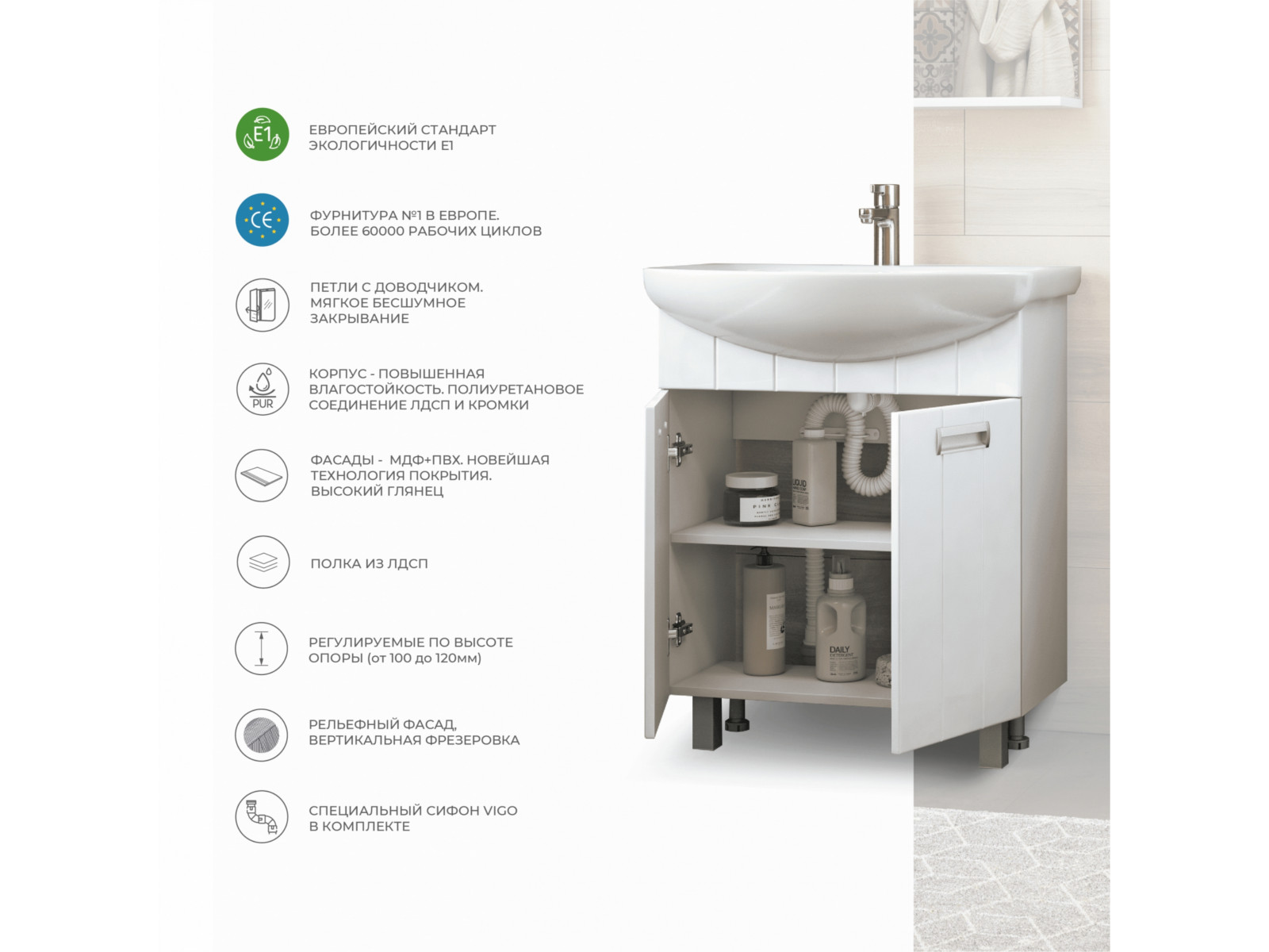 Фурнитура: хром, петли с механизмом плавного закрывания