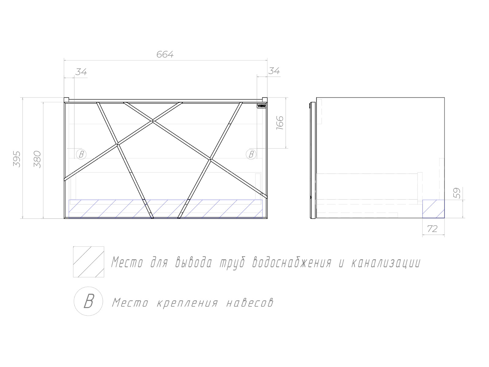 Оснащение: 1 выдвижной ящик, направляющие скрытого монтажа, открывание нажатием "push-to-open", 2 навеса, 1 сифон