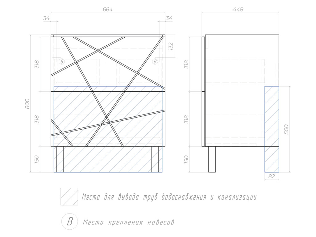 Оснащение: 2 выдвижных ящика, механизм открывания push-to-open, опоры квадратные регулируемые.