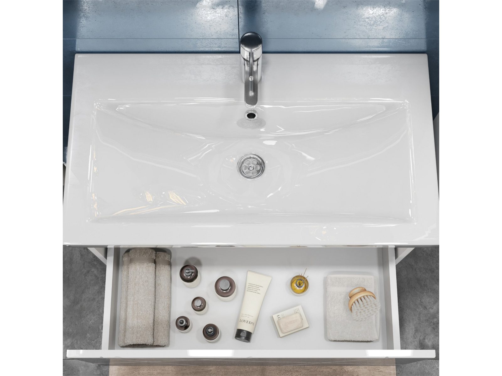 Оснащение: 1 выдвижной ящик, направляющие скрытого монтажа, открывание нажатием "push-to-open", 2 навеса, 1 сифон