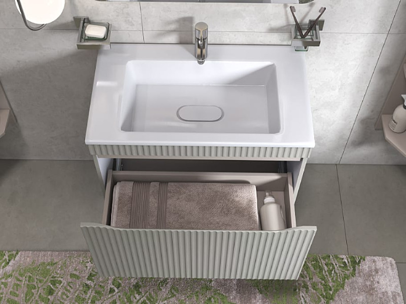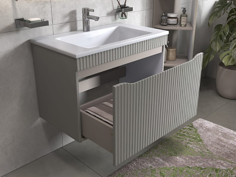 Материалы тумбы: влагостойкая МДФ, полимерное покрытие ПВХ, внутренние элементы из ЛДСП, европейская фурнитура