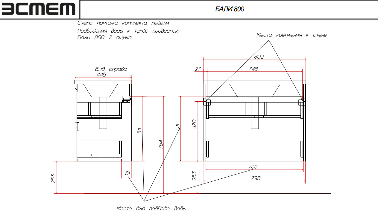 Тумба с раковиной Bali 800 навесная 2 ящика