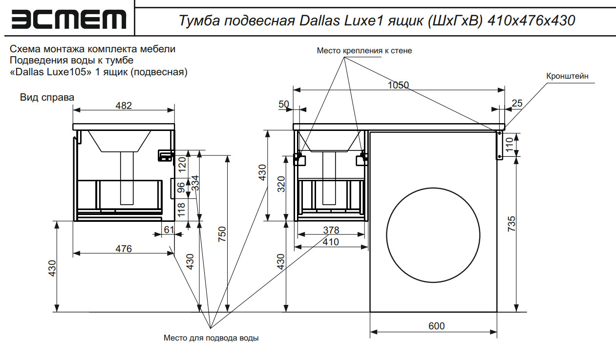 Тумба с раковиной Dallas Luxe 1050 навесная 1 ящик левая
