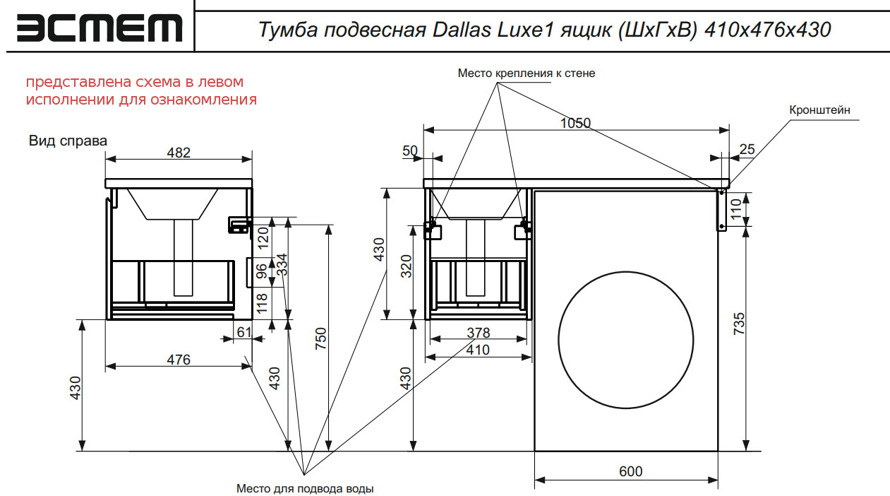 Тумба с раковиной Dallas Luxe 1050 навесная 1 ящик правая