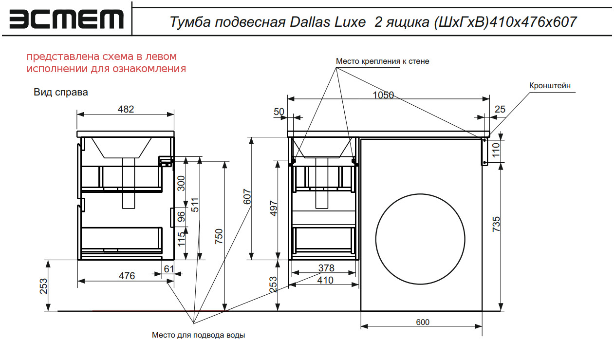 Тумба с раковиной Dallas Luxe 1050 навесная 2 ящика правая