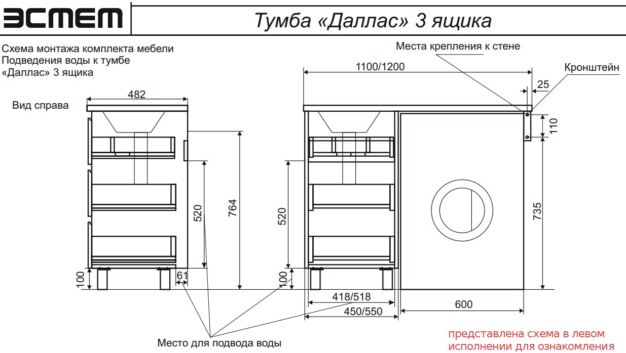Тумба с раковиной Dallas Luxe 1100 напольная 3 ящика правая