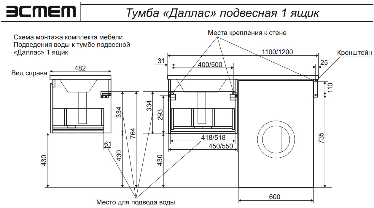 - Тумба с раковиной Dallas Luxe 1200 навесная 1 ящик левая