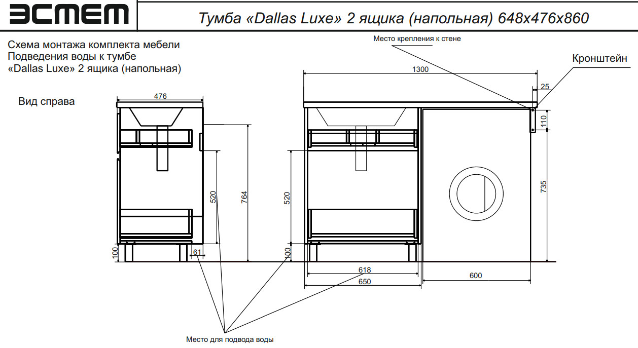 - Тумба с раковиной Dallas Luxe 1300 напольная 2 ящика левая