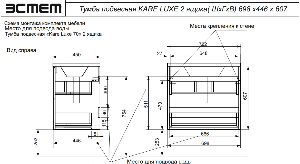 - Тумба с раковиной Kare Luxe 700 навесная 2 ящика