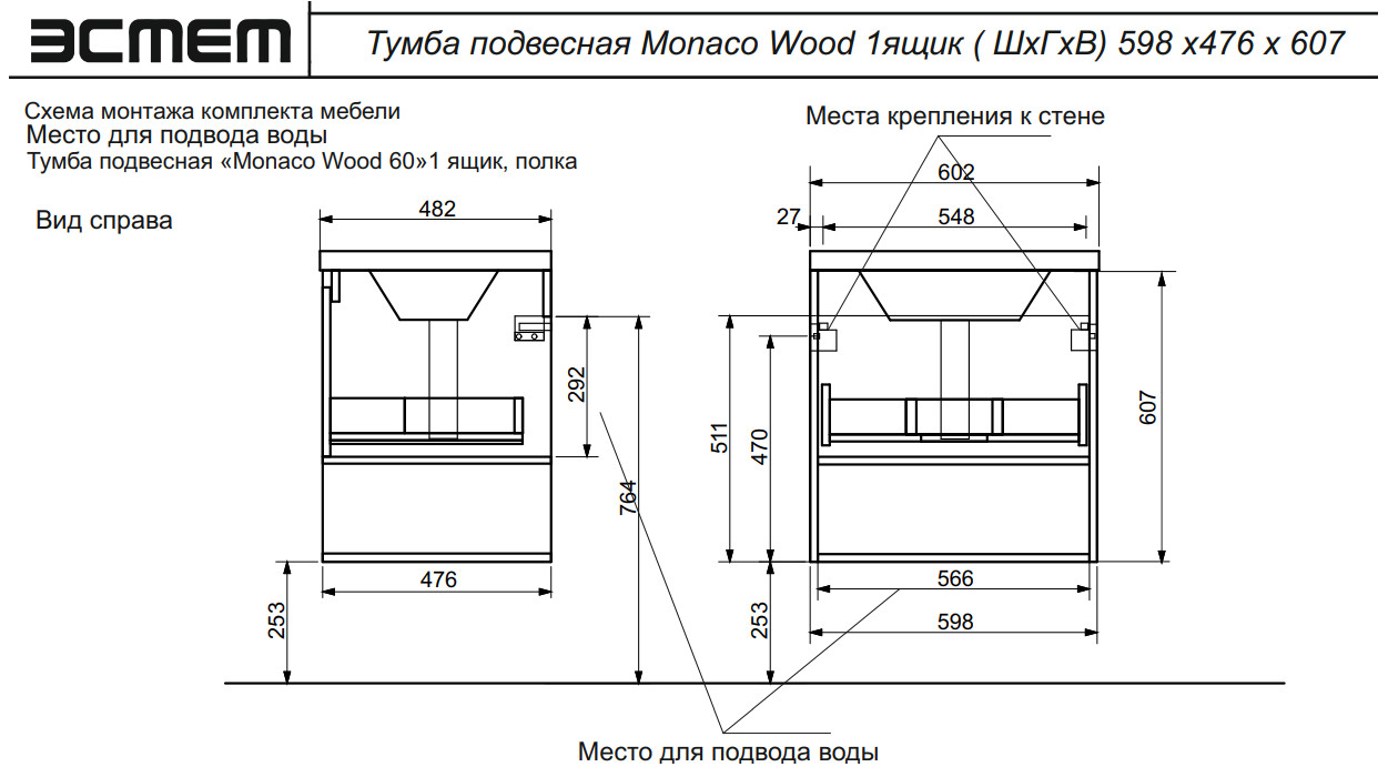 - Тумба с раковиной Monaco Wood 600 1 ящик с нишей