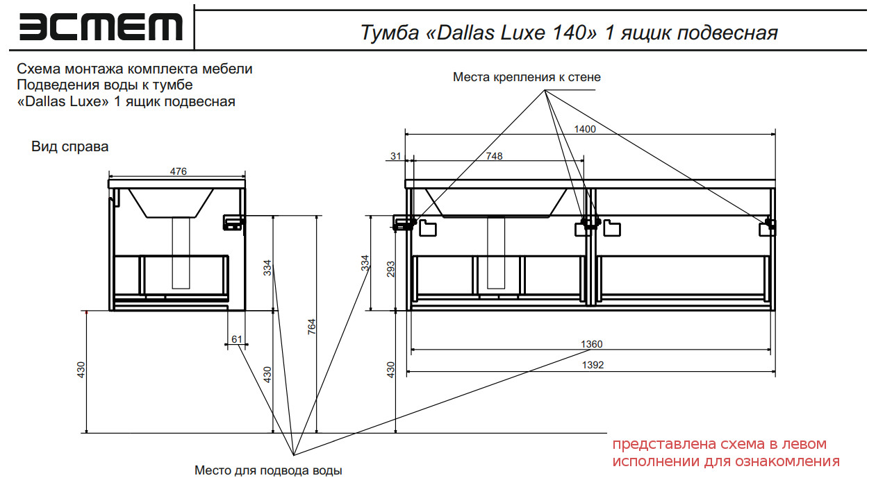 - Тумба с раковиной справа Dallas Luxe 1400 навесная 1 длинный ящик