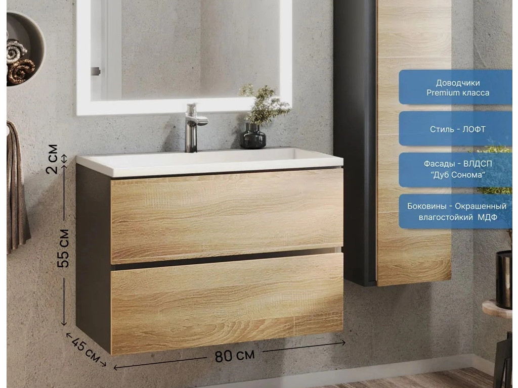 Фасад - ЛДСП в пленке под дерево, цвет дуб сонома. Выдвижные ящики изготовлены из влагостойкой ЛДСП. Ящики оснащены доводчиками. Фурнитура и доводчики премиум класса.