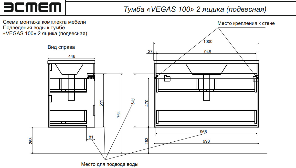 - Тумба с раковиной Vegas 1000 навесная 2 ящика