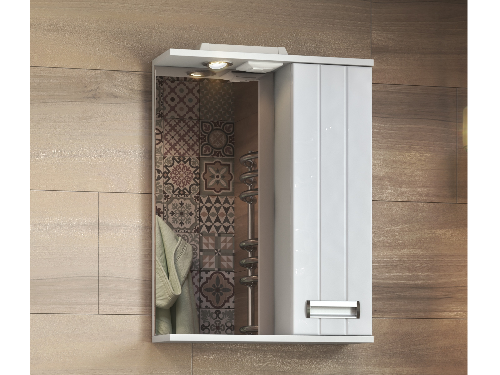 Оснащение: 1 дверца; 2 полки ЛДСП, 1 светодиодный светильник, включатель с розеткой; ручка врезная металлическая хромированная.