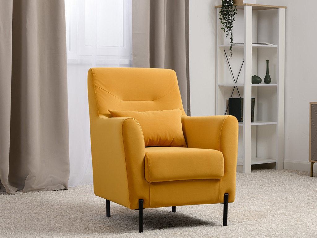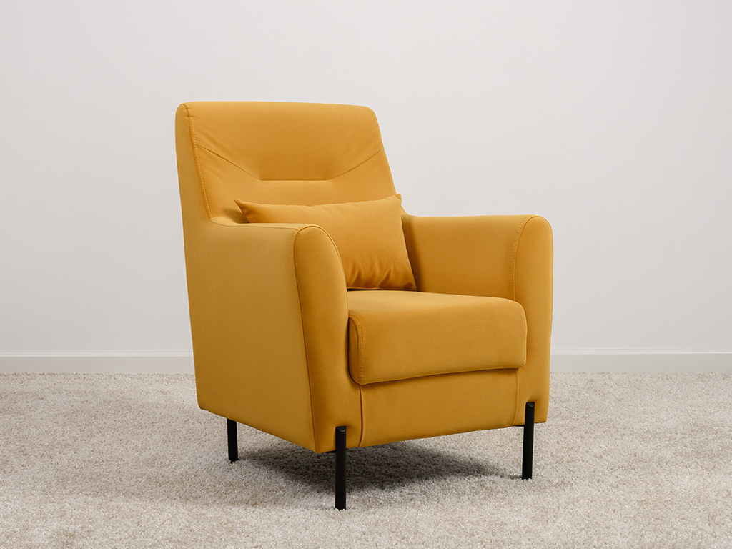 Декоративная утяжка на спинке кресла, декоративная подушка в цвете кресла, металлические опоры переходят в декоративный элемент подлокотника