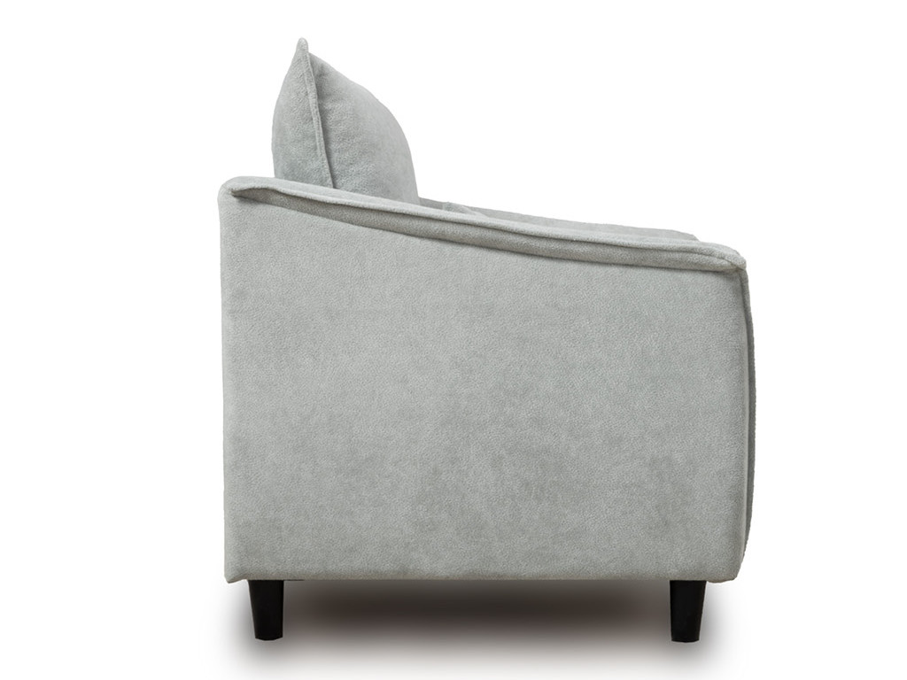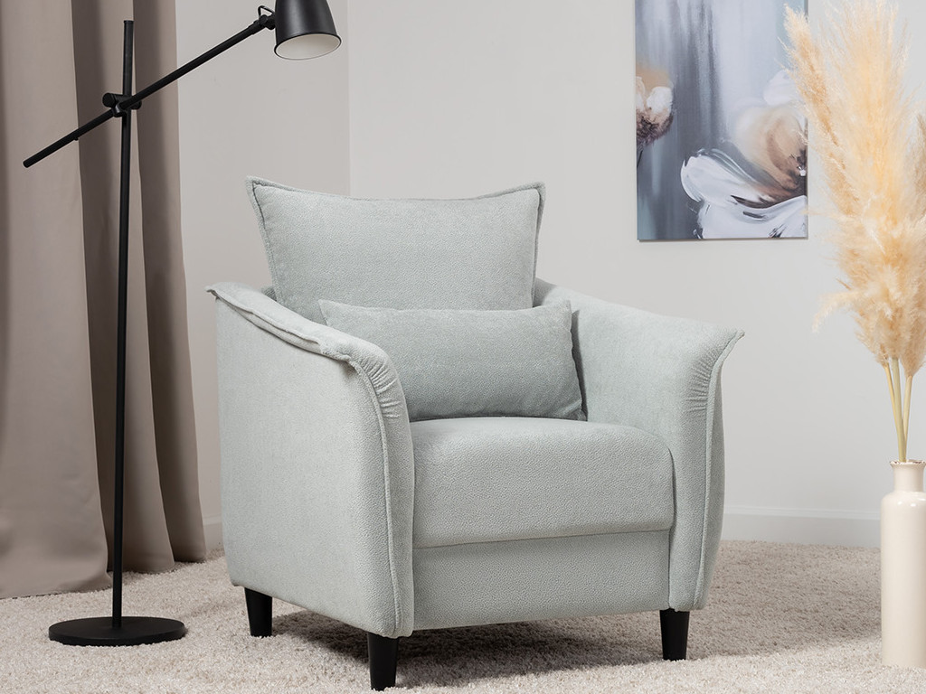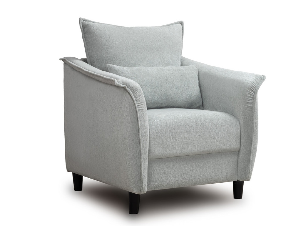 Кресло с приспинной подушкой трапецивидной формы на молнии, по трем сторонам которой проложена отделочная строчка на 1,2 см. По контуру боковин проложен декоративный кант на 1,2 см основной ткани. Кант проходит по центру передней части боковины, а по внутренней верхней части сборка.