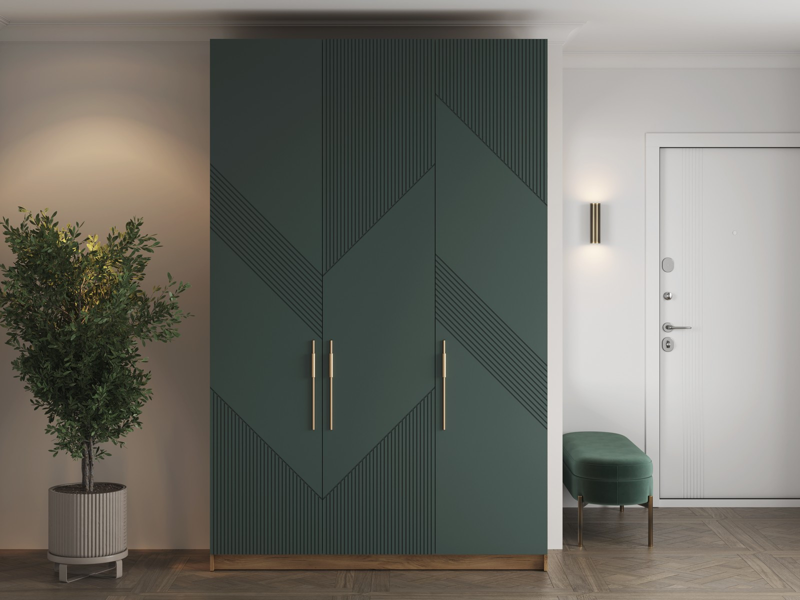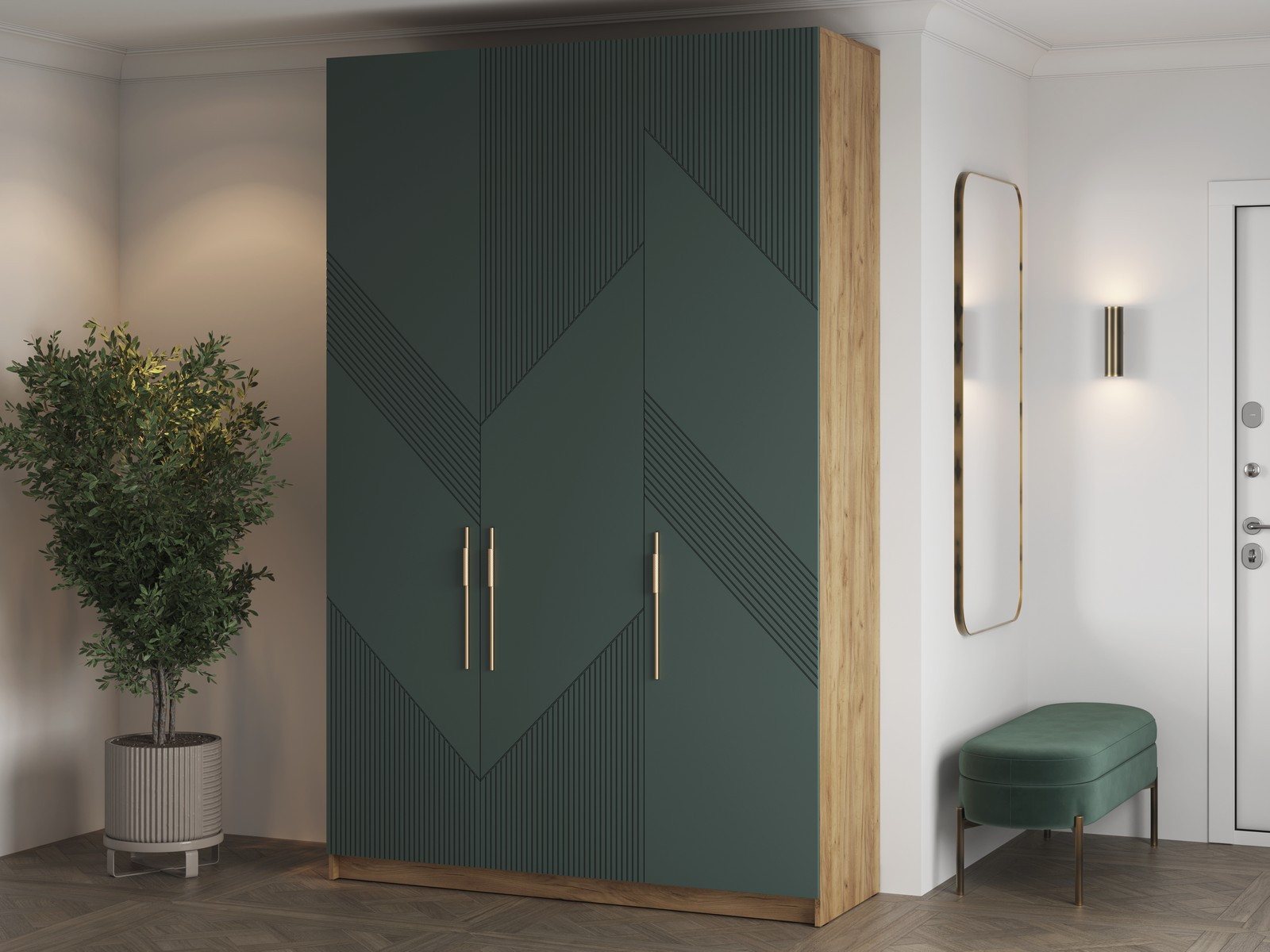 Две оставшиеся секции, габаритами Д.482хВ.2254хГ.490мм., расположены по бокам от центральной и идентичны друг другу. В низу и наверху имеются несъемные полки-вязки, пространство над и под которыми по 300мм. Между полками имеется пространство в 1622мм высотой и 490мм глубиной, в котором расположена овальная металлическая штанга на металлических штангодержателях для одежды. Штанга располагается на высоте 1957мм. от уровня пола, расстояние от штанги до нижней вязки – 1546мм