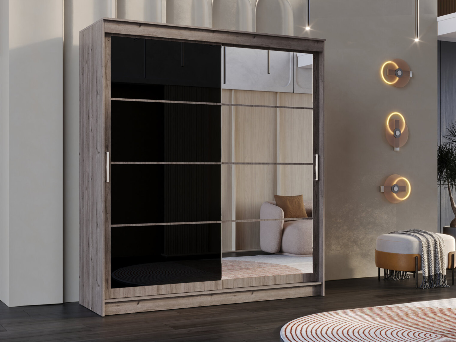 - Шкаф-купе Гранд-1 2000 Дуб Горный-двери Зеркало-Лакобель черный
