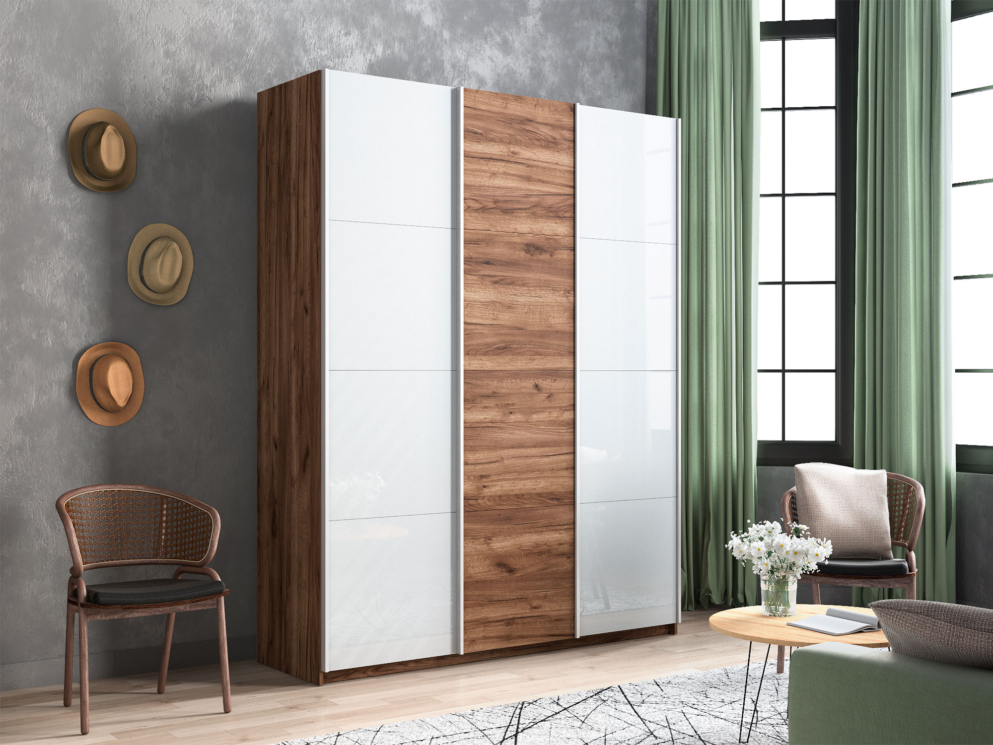 Шкаф-купе Прайм 3-х дверный 1800 два Стекла Белые/ДСП Крафт табачный