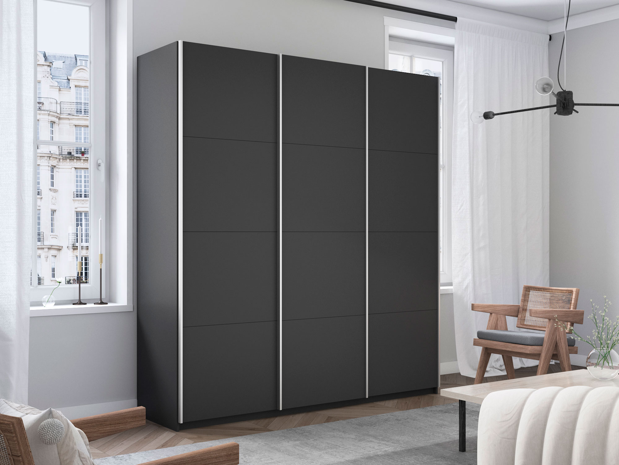 - Усиленная навесная система дверей помогает ходовому профилю выдерживать высокие нагрузки, а также сохраняет полезную площадь внутри шкафа, благодаря установке снаружи корпуса