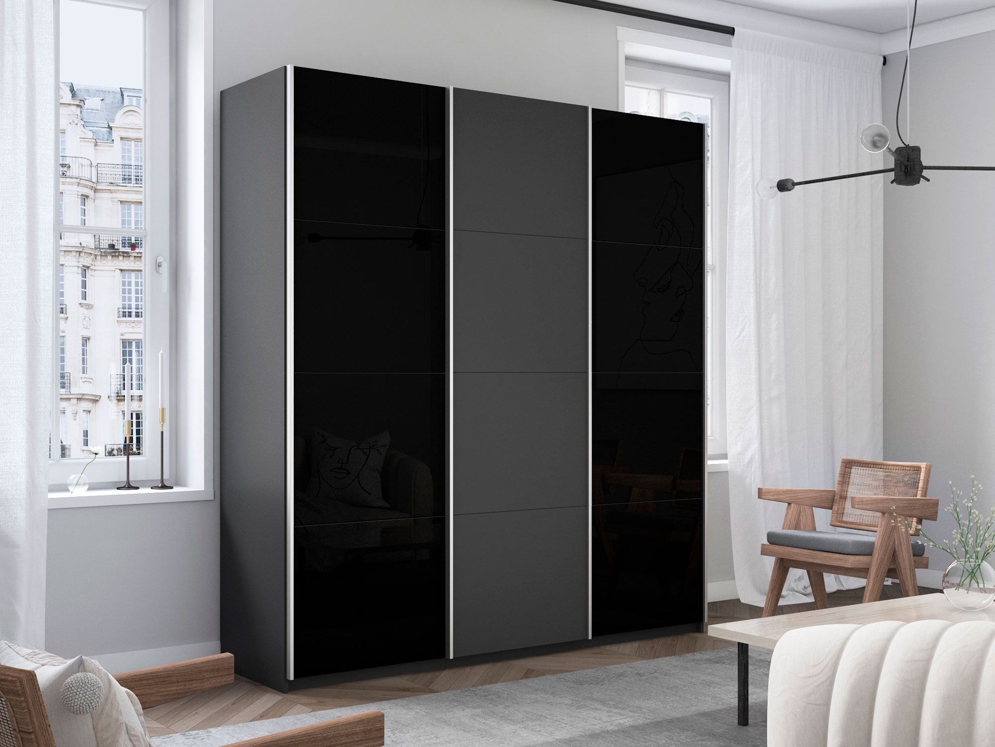 - Шкаф-купе Прайм Широкий 3-х дверный два черных стекла/ДСП Серый Диамант