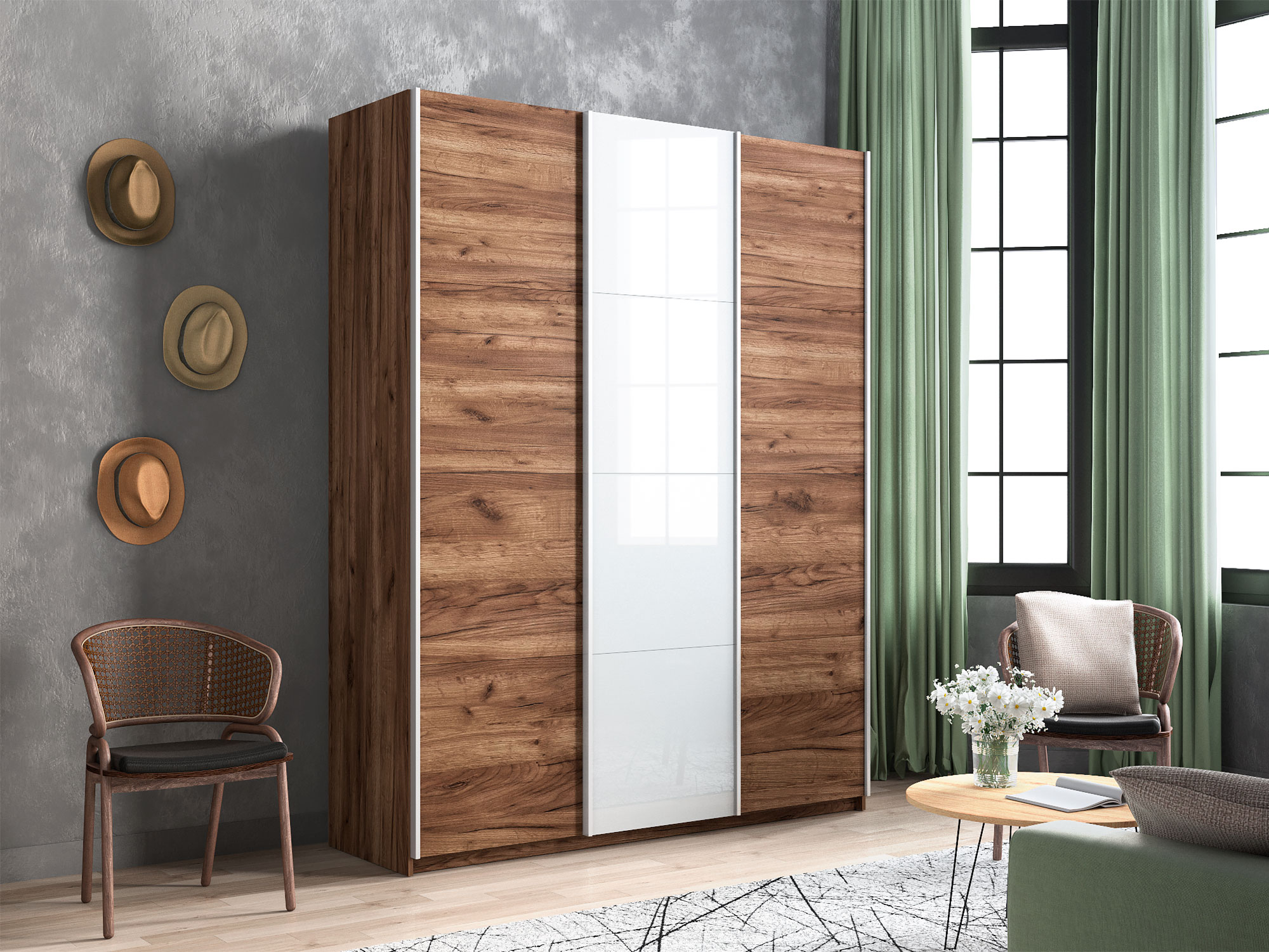 Шкаф-купе Прайм Широкий 3-х дверный два ДСП/Стекло Белое Крафт табачный