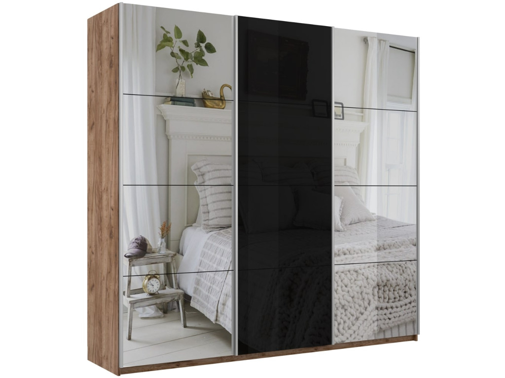- Шкаф-купе Прайм Широкий 3-х дверный два зеркала/стекло черное Крафт табачный