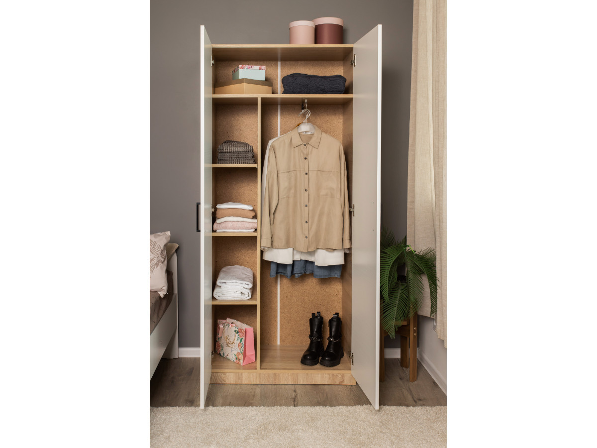 - Функциональное сочетание распашного шкафа со штангой и полочкой для головных уборов.