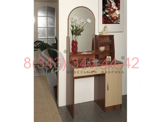 Стол с фигурным зеркалом и открытыми полками сверху, под столешницей - выдвижной ящик и секция с полкой за распашной дверью.
