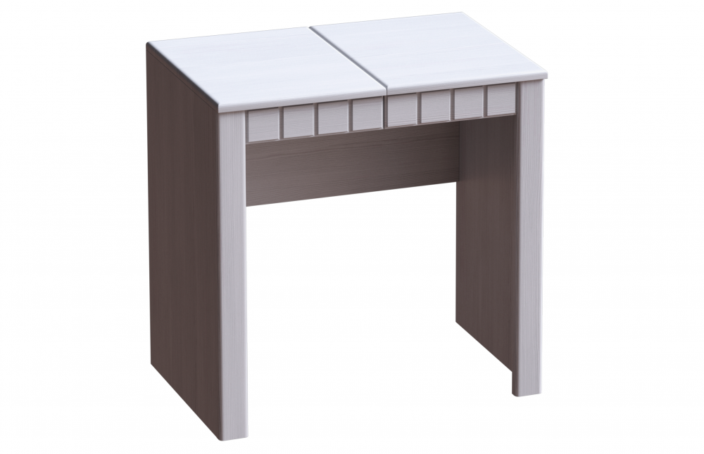Туалетный стол разделён на две части: - справа под столешницей находится выдвижной ящик на шариковых направляющих; - слева под столешницей находятся три ниши для хранения туалетных аксессуаров. Сама столешница открывается вверх. На ней расположено зеркало.
